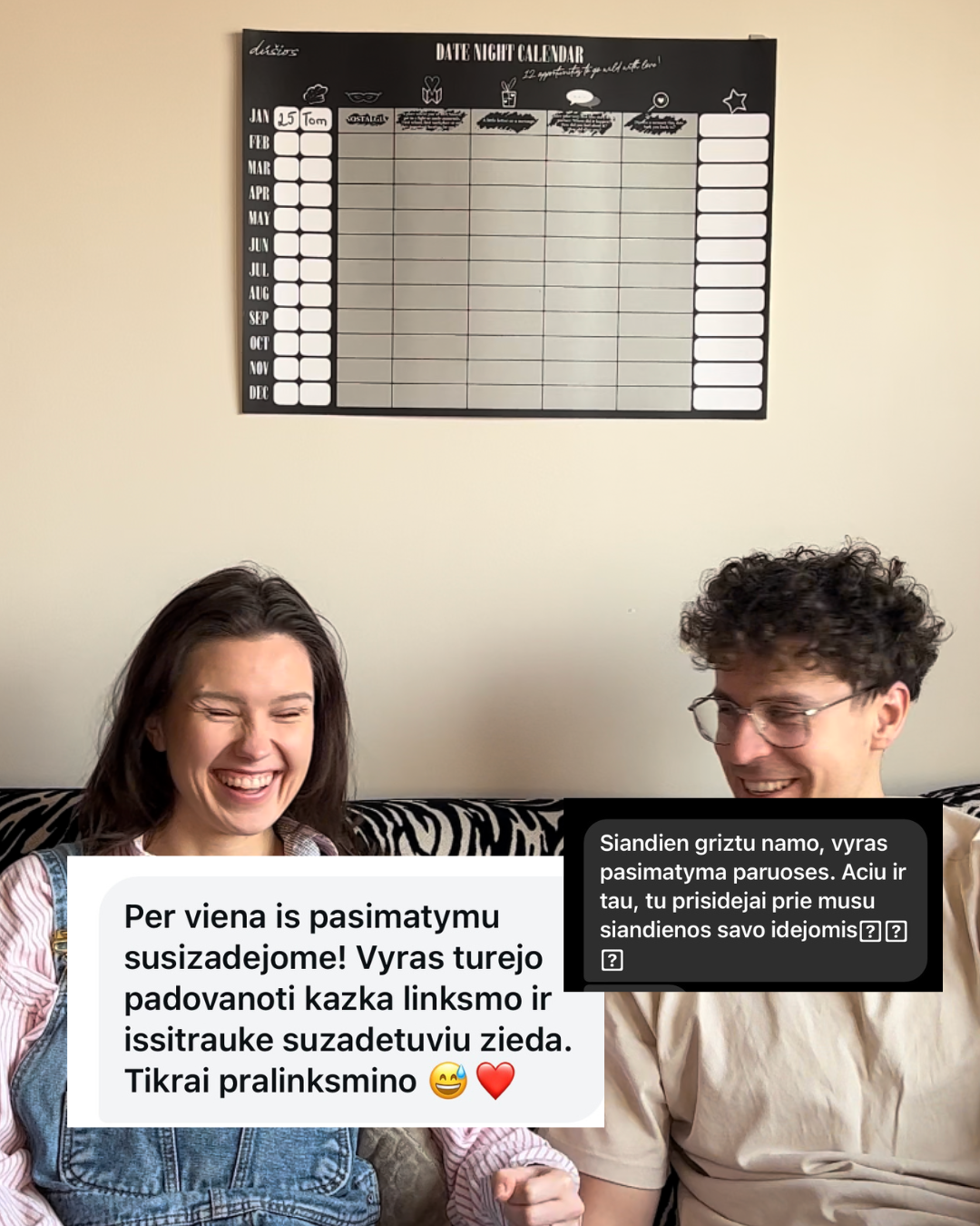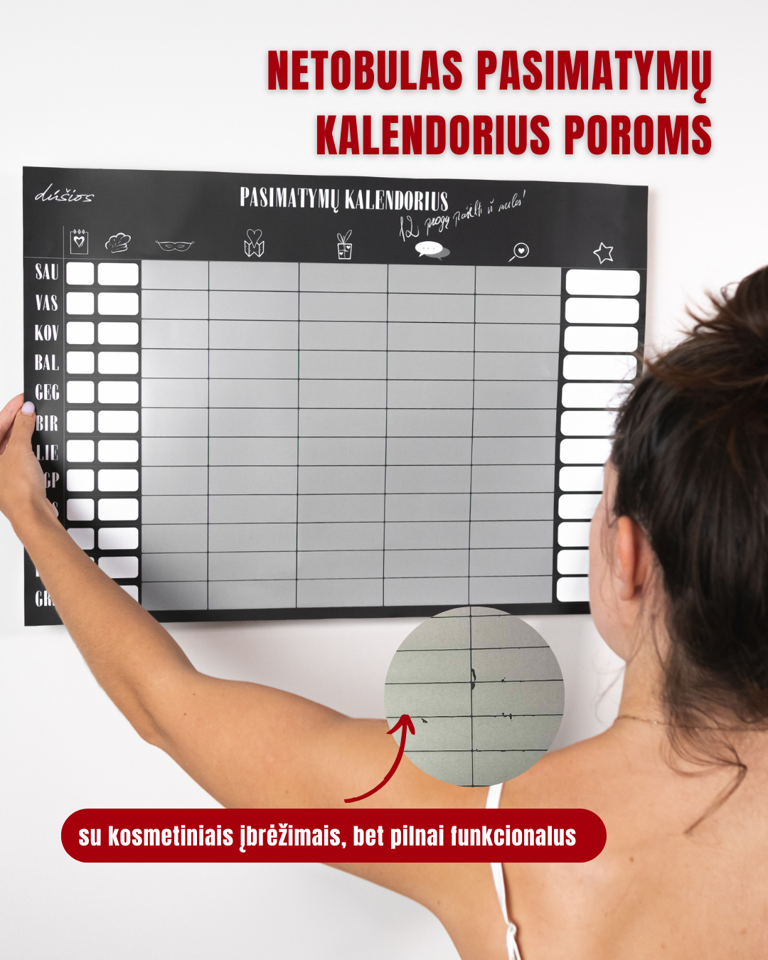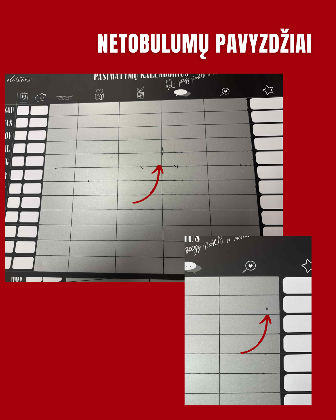 Netobulas pasimatymų kalendorius – tai tas pats klientų pamiltas Pasimatymų kalendorius poroms, tik su nedideliais kosmetiniais netobulumais (pvz., įbrėžimas). Kalendorius pilnai funkcionalus: pasimatymų idėjos, užduotys – malonus ir veikiantis būdas skirti laiko jums dviems. Kalendorius jums padės jei laikas dviese vis tampa dar vienu filmu, o galva tuščia, ką smagaus nuveikti.